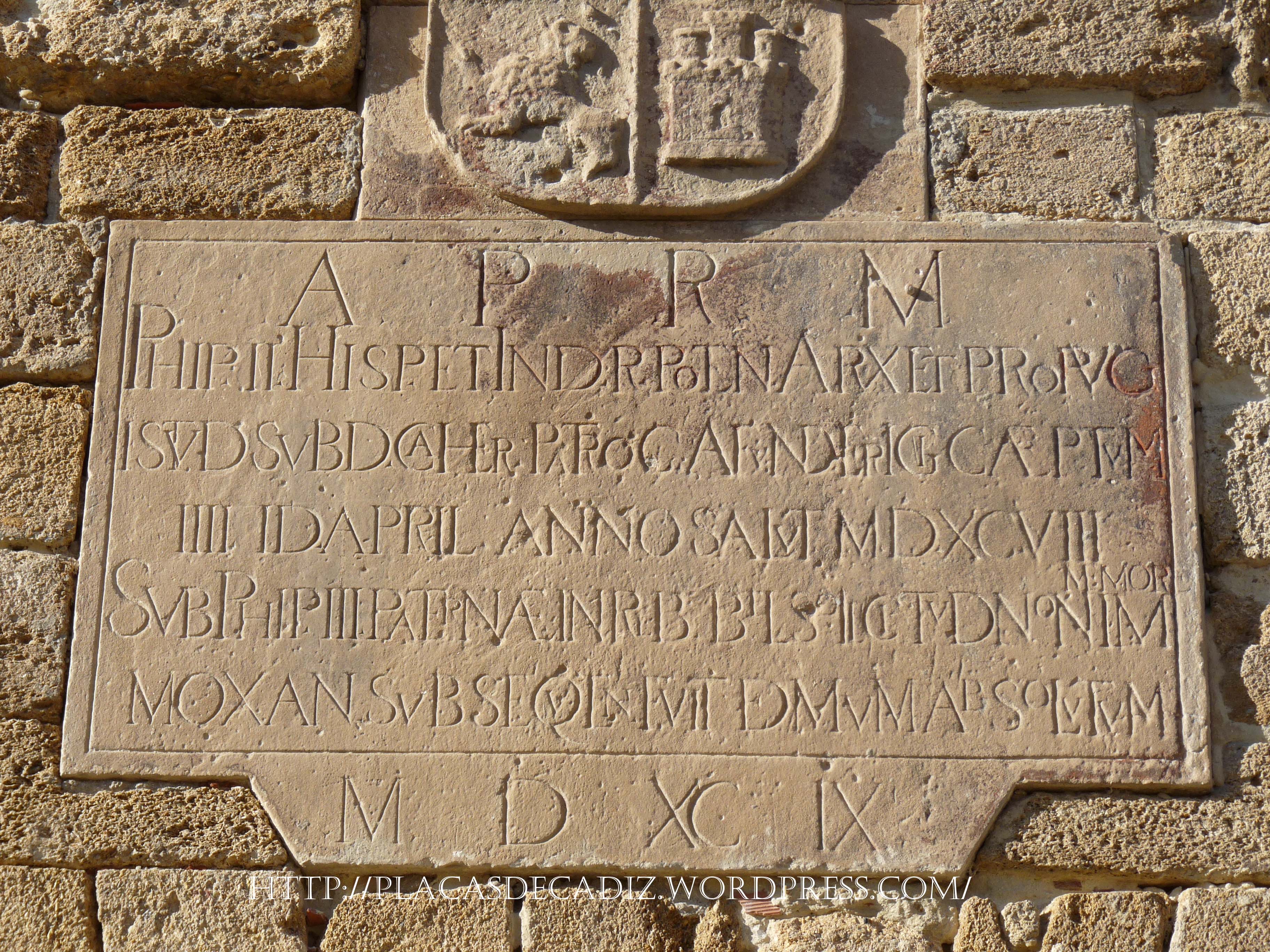 Texto: Saludo a la Majestad del Rey Felipe II, rey de las Españas y de las Indias ordeno enviar tropas del reino de Castilla, desde este lugar, a su hijo y sucesor, para conquistar y apoderarse de los reinos africanos, el 19 de Julio del año de la salud de 1598. Bajo el Reinado de Felipe III, felizmente, por deseo y en memoria de su padre, fue colocada despues esta lápida al año siguiente. 1599